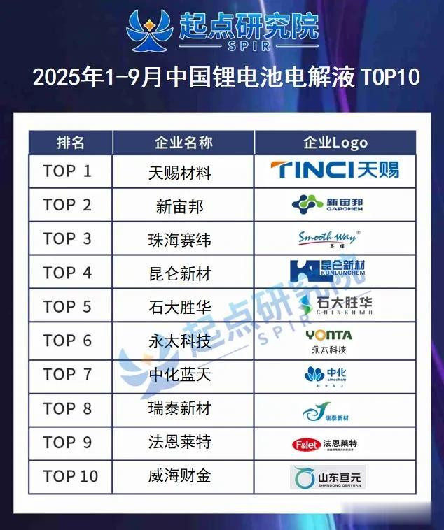 作为全球电解液龙头企业,天赐材料已连续10年出货位居榜首。据起点研究院SPIR最新数据显示,2025年1-9月中国锂电池电解液出货量为145.6万吨,同比增长53.1%,天赐材料继续位列TOP1。